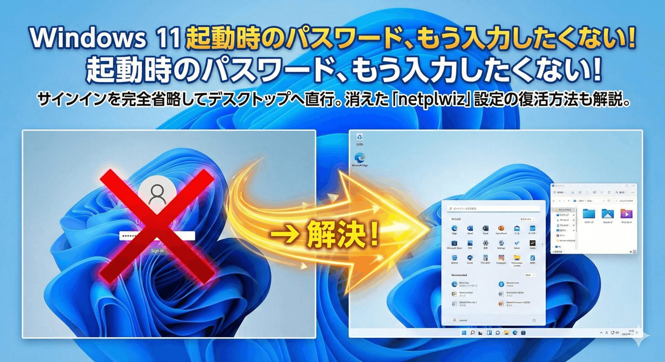 Windows 11を使っていると、起動するたびにパスワードやPINの入力を求められるのが少し手間に感じること、ありますよね。自分しか使わない自宅のPCなら、電源ボタンを押してそのままデスクトップ画面 ...