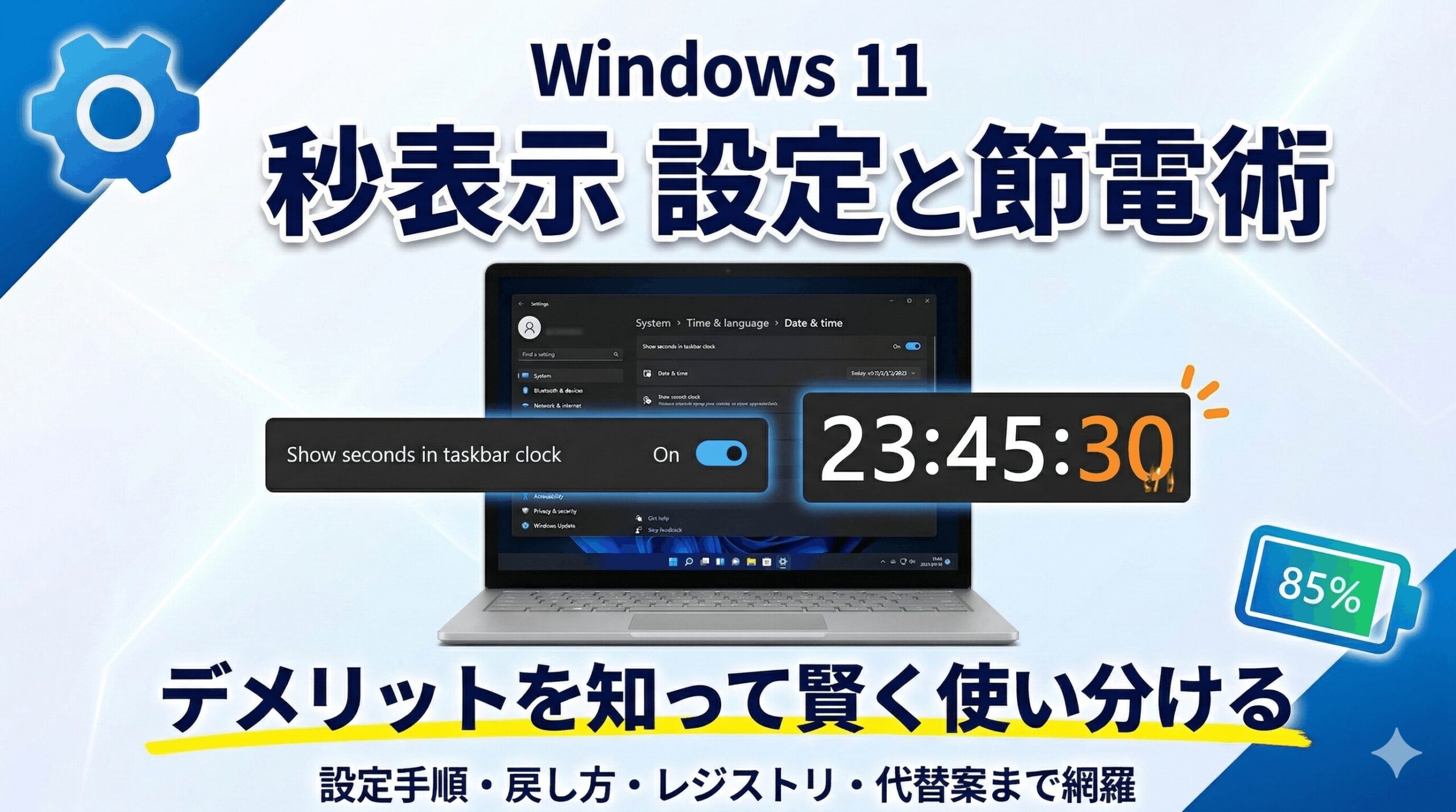 Windows 11のタスクバーにある時計、やっぱり秒単位までしっかり見たいときってありますよね。でも、設定画面を開くと「電力消費が増加します」なんて警告が出てきて、ちょっとためらっちゃう人も多いんじ ...