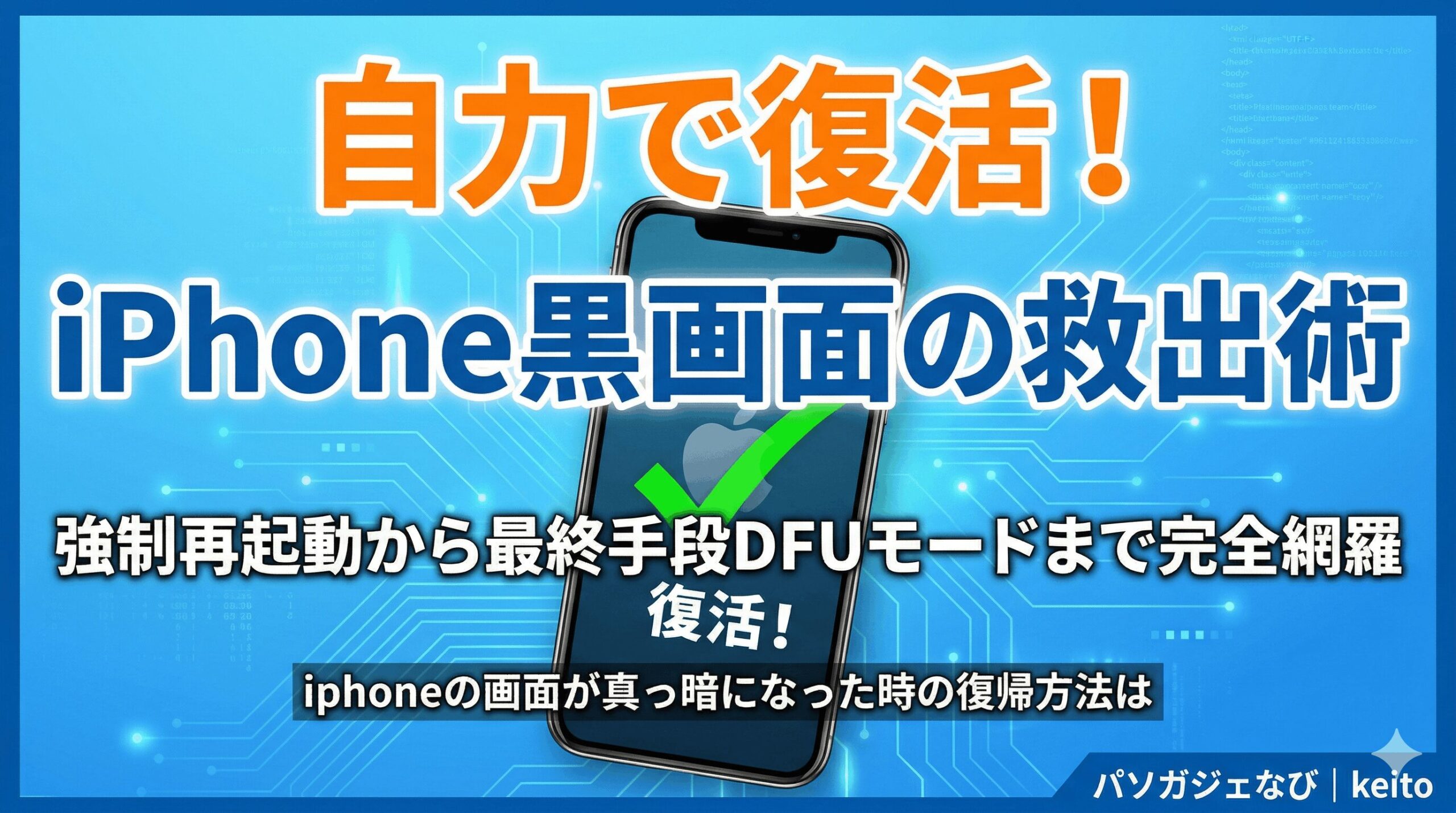 こんにちは、パソガジェなびのkeitoです。ふと気づいたらiPhoneの画面が真っ暗になっていて、何をしても反応しない…。こんな絶望的な状況に陥っていませんか?ここ、気になりますよね。大切な写真やLI ...