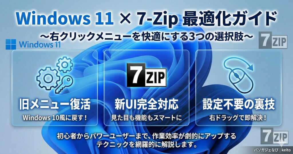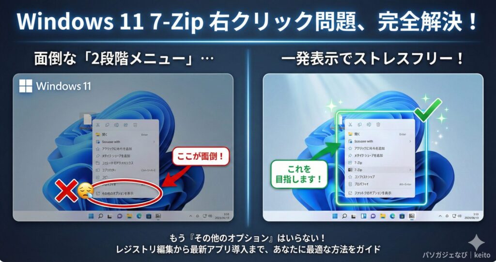 この記事では、Windows 11の7-Zipを右クリックでスムーズに使うための設定方法や、メニューが表示されないトラブルの解決策を分かりやすく紹介します。