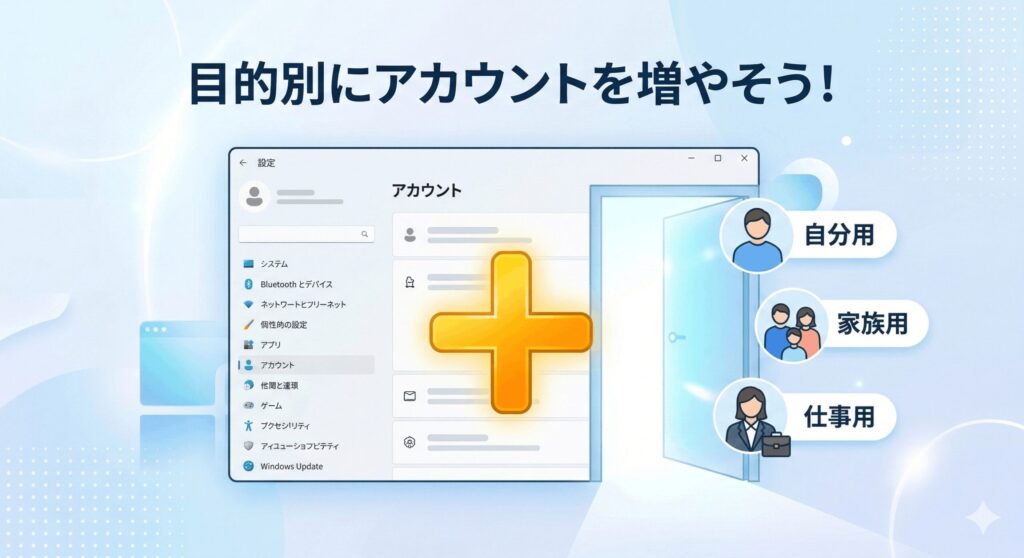 「よし、作ってみよう!」と思った時に、「設定のどこだっけ?」と迷うこと、ありますよね。基本のルートは「設定」>「アカウント」>「他のユーザー」です。ここにある「アカウントの追加」ボタンを押すと、入力画面が開きます。この画面、たまに少し表示が遅いことがあるので、クリックした後は焦らずちょっとだけ待ってみてくださいね。