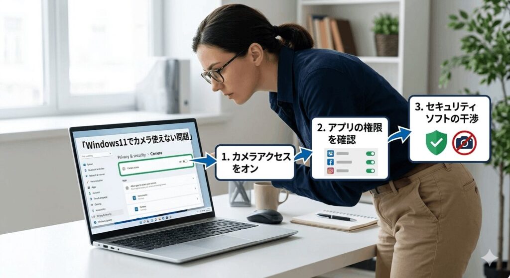 Windows 11ではセキュリティが強化されており、アプリごとにカメラの使用許可を細かく管理しています。設定の「プライバシーとセキュリティ」から「カメラ」を開き、一番上の「カメラアクセス」がオンになっているか確認しましょう。ここがオフだと、全ての機能が停止してしまいます。