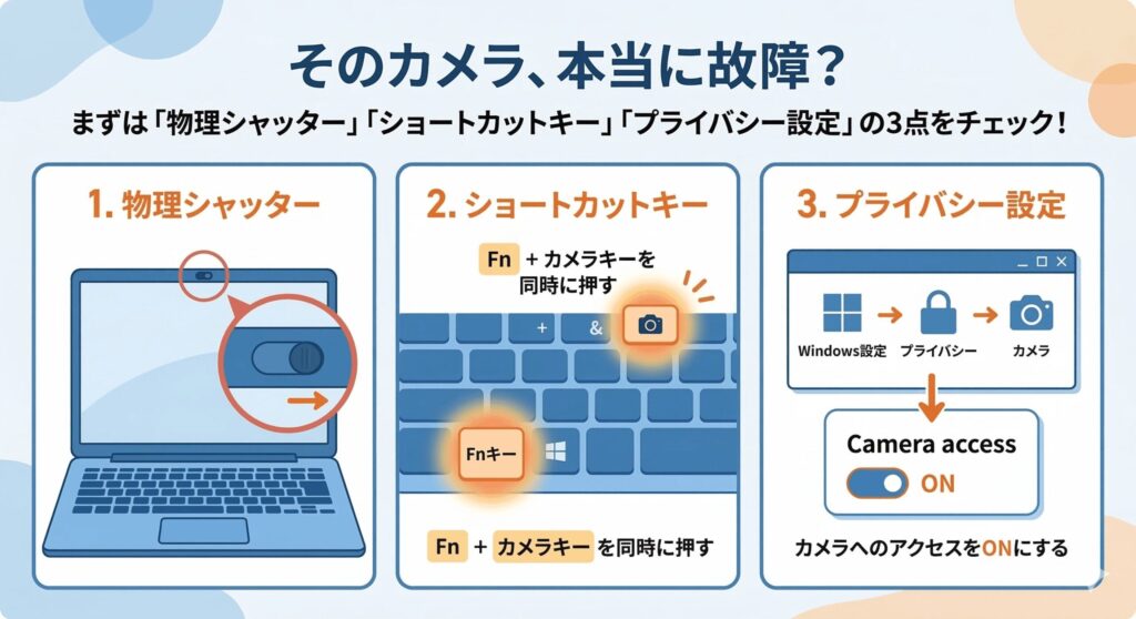 - 物理的なシャッターやメーカー独自のカメラオフ設定をまず疑う