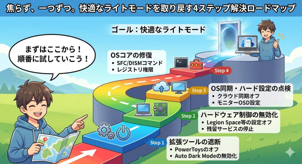 さて、今回はWindows 11で勝手にダークモードになるという厄介な問題について、その背景にある様々な原因と具体的な解決策を順番に解説してきました。Microsoft公式のPowerToysの予期せぬバグから始まり、OLEDディスプレイを保護しようとするPCメーカー独自の親切機能、Auto Dark Modeなどの外部カスタマイズアプリの干渉、さらにはOSのアカウント同期設定まで、本当にたくさんの要素が複雑に絡み合っているんですよね。