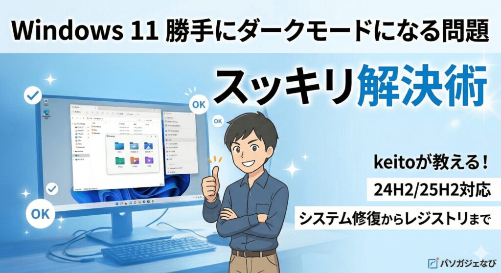 こんにちは、パソガジェなびのkeitoです。最近パソコンを使っていると、なぜかWindows 11が勝手にダークモードになる現象に悩まされていませんか。せっかく見やすいライトモードに設定したのに、気づけば真っ暗な画面に戻ってしまうという相談をよく受けます。実はこの問題は単なる設定ミスではなく、システムファイル修復が必要なケースやMicrosoft公式のPowerToysというツールが影響していることが多いんです。