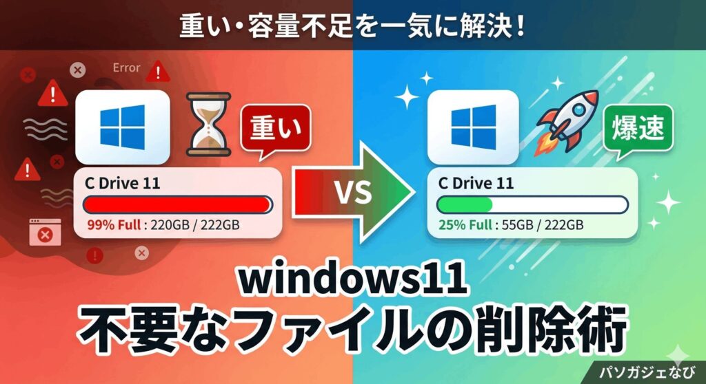 こんにちは、パソガジェなびのkeitoです。パソコンを使っていると、いつの間にかCドライブの空き容量が減っていて驚くことってありますよね。windows11の不要なファイルの削除を適切に行うことは、単にデータを消す以上のメリットがあるんです。ストレージに余裕を持たせることで、パソコンの立ち上がりを早くする効果も期待できますし、何よりシステム全体の安定感が変わってきます。