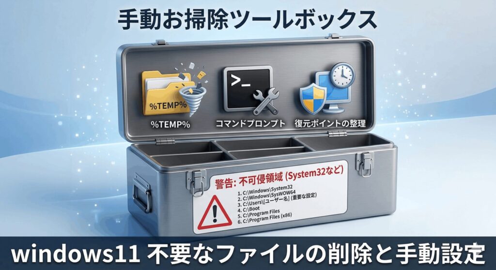 標準ツールだけでは届かない「隙間」の掃除や、より詳細なカスタマイズを求める方に向けて、手動での最適化戦略を解説します。ただし、ここからは一歩間違えるとシステムが不安定になるリスクも伴います。慎重に進めていきましょう。