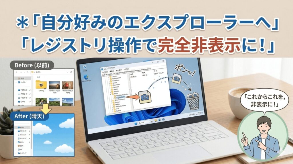 標準の設定だけでは、ナビゲーションペインから「ギャラリー」の文字を完全に消し去ることはできません。ここからは、一歩踏み込んでシステムレベルでこの機能を無効化するテクニックをご紹介します。