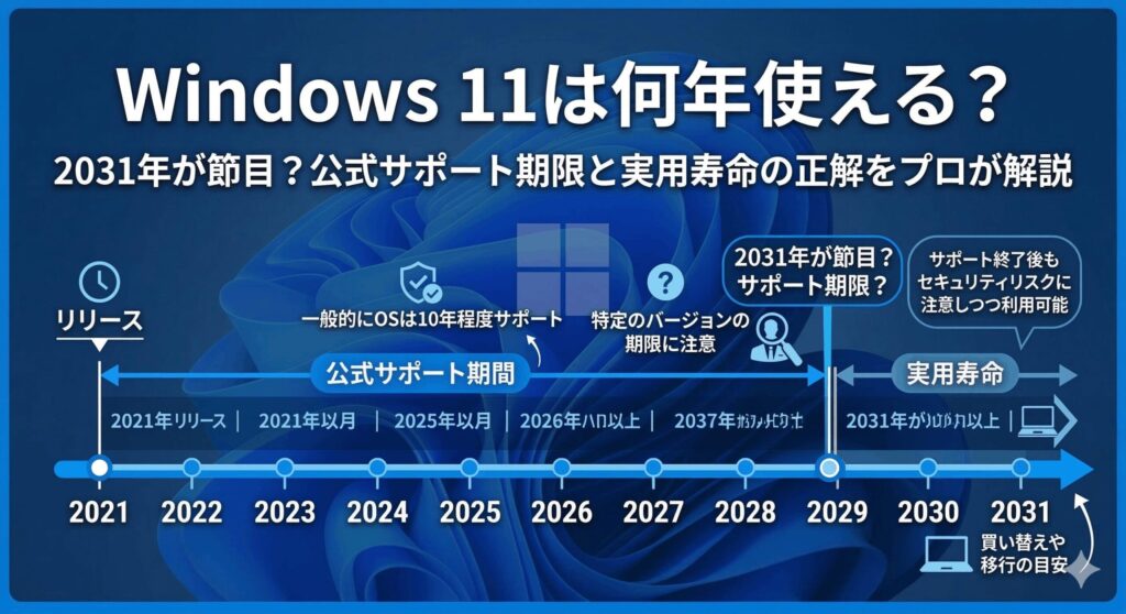 Windows 11は、従来のOSとは異なり「モダンライフサイクルポリシー」という仕組みで管理されています。これは、ユーザーがシステム要件を満たし、最新の状態に維持している限り、サポートが継続されるという考え方です。現時点で全体の終了日は明示されていませんが、過去のOSが約10年間のサイクルだったことを考えると、2021年の登場から少なくとも2031年頃まではメインのサポートが続くと予想するのが現実的ですね。