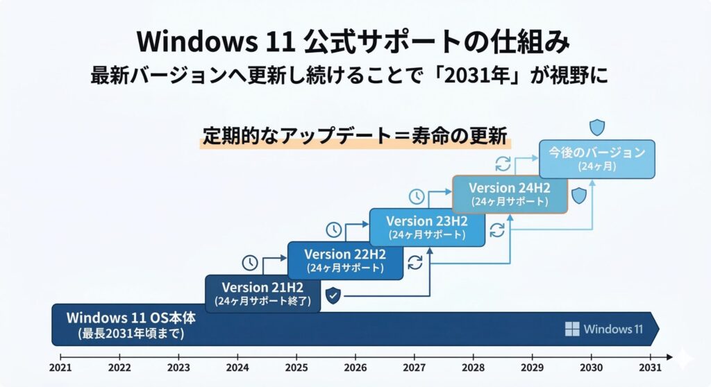 Windows 11は「サービスとしてのWindows」であり、定期的な更新を適用し続けることで、2030年代初頭までは公式サポートを受けられる可能性が高いです。