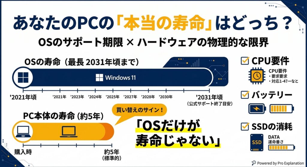どれだけOSのサポートが長くても、PCには「物理的な寿命」があります。特にノートPCの場合、バッテリーの寿命は2〜3年、SSDや冷却ファンは5年前後が交換の目安とされています。OSが2031年まで使えるからといって、1台のノートPCで10年間完走するのは現実的にかなり厳しいのが本当のところです。一般的に、ビジネスやプライベートで毎日使うPCの買い替えサイクルは4〜5年が最も効率的だと言われています。
