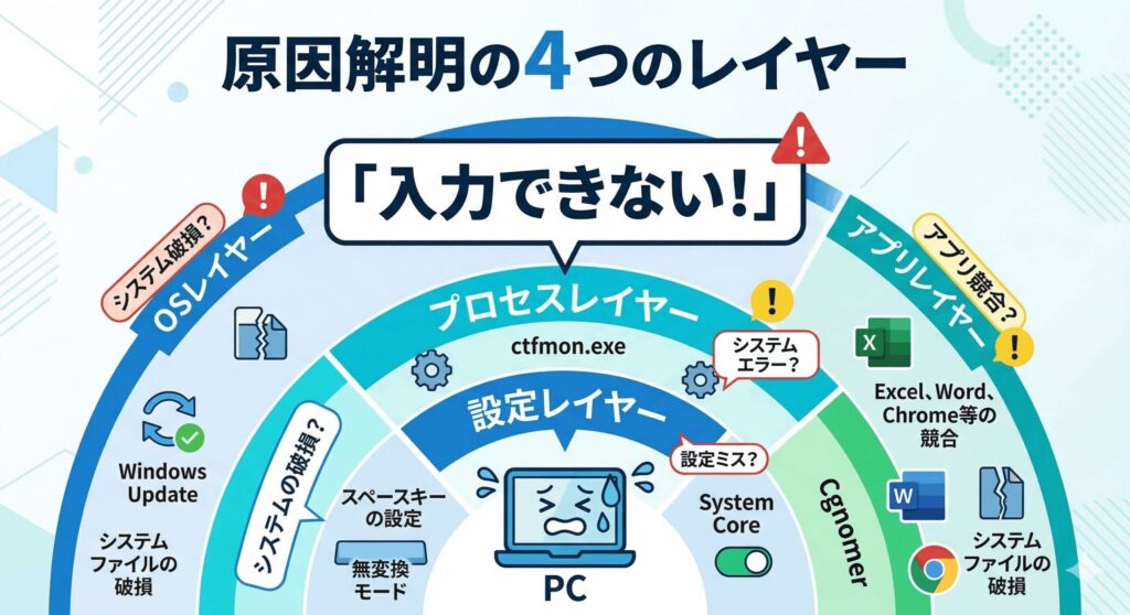 まずは、どうしてこんなトラブルが起きるのか、その根本的な原因からサクッと見ていきましょう。一口に変換できないと言っても、実は裏でキーボードの細かな設定やシステムプロセスなど、いろんなレイヤーが複雑に絡んでいるんですよね。ここを理解しておくと、対処がぐっと楽になりますよ。