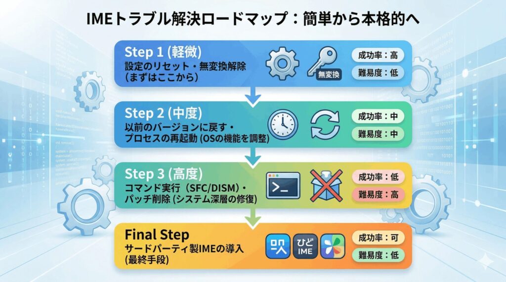 さて、ここまでさまざまな障害のメカニズムと解決策を網羅的に見てきましたが、いかがでしたでしょうか。windows11 漢字変換できなくなったというトラブルは、ちょっとしたキーの打ち間違いによる設定の固定化から、マルチプロセスアプリ特有のAPI競合、さらにはOS深層のシステムバグまで、本当に原因のレイヤーが幅広いんです。