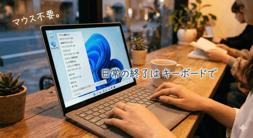 マウスレス操作の基本は「Win + X」からのアルファベット入力です。これを覚えるだけで、GUI操作よりも遥かに速くPCを制御できるようになりますよ。
