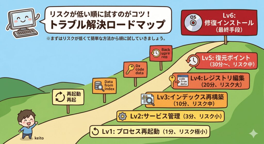 ここからは、実際にトラブルに見舞われたときに試していただきたい、具体的な解決手順をステップバイステップで解説していきますね。安全でリスクの低い簡単なものから順に紹介するので、上から順番に試してみてください。