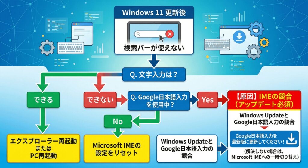 検索ウィンドウ自体はパッと開くのに、いざキーボードを叩いても文字が全く入力されない。この症状、作業が完全に止まってしまって本当に困りますよね。実はこの問題、Windows 11自体の致命的なバグというよりも、皆さんが普段使っているサードパーティ製の文字入力ソフト(IME)との相性が悪くなっていることが最大の原因なんです。特に「Google日本語入力」を愛用している環境で、この報告が急増しています。