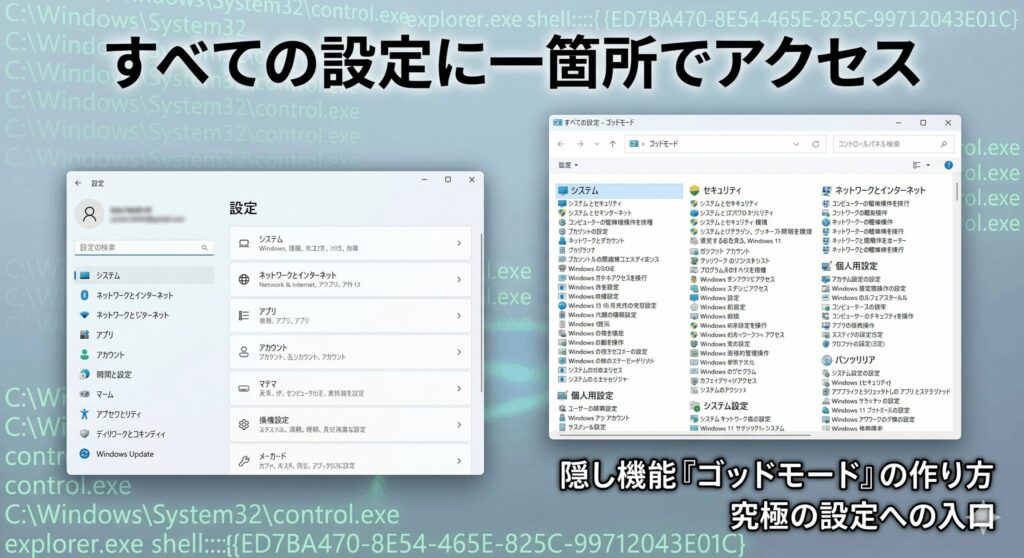最初の「GodMode」の部分は「最強設定」など好きな名前に変えても大丈夫ですが、ドット(.)以降のカッコで囲まれた英数字はレジストリを呼び出す呪文なので、正確にコピペしてください。名前を確定した瞬間、ただのフォルダアイコンがシステムアイコンに変化し、中を開くと圧倒的な数の設定項目がズラーッと並びます。さらに詳しい活用法については、ゴッドモードの完全マニュアルも併せてご覧ください。