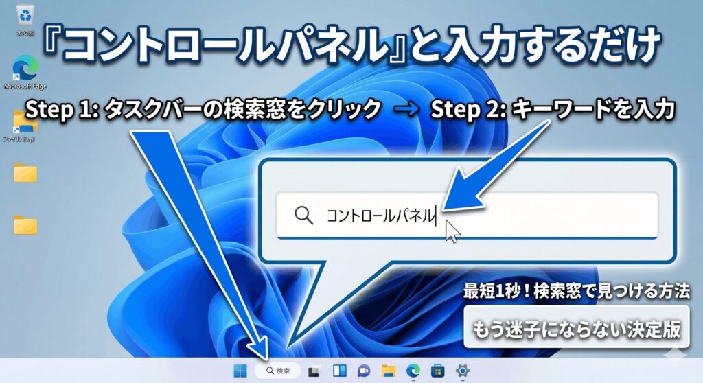 やり方はとってもシンプルで、画面下部にある虫眼鏡のアイコン、もしくはスタートボタンをクリックして、上部の検索ボックスに「コントロールパネル」と入力するだけです。実は最後まで打ち込まなくても、「コントロール」やアルファベットで「con」と打つだけで、強力な予測変換が働いて一番上にアプリアイコンがハイライト表示されるかなと思います。あとは表示されたアイコンをクリックすれば、すぐにおなじみの画面が立ち上がります。