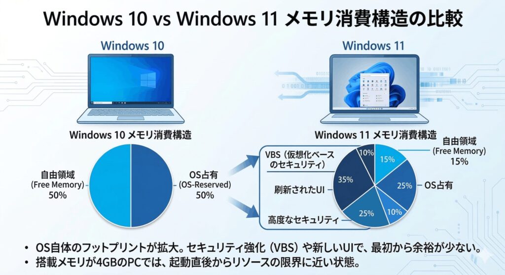 - Windows 11独自のメモリ消費構造と特定サービスの不具合への理解