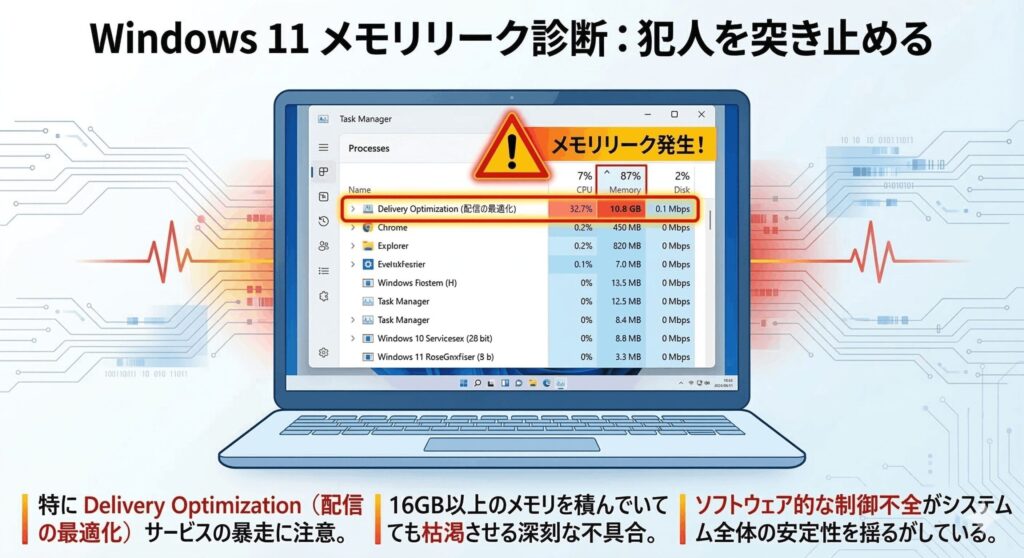 Windows 11の利便性を高めるはずの「Delivery Optimization(配信の最適化)」という機能が、実はエラーの引き金になっていることがあります。これは本来、同じネットワーク内のPC同士で更新データを共有し、回線負荷を減らすための仕組みです。しかし、2025年末から2026年にかけて、特定の環境でメモリを無限に確保し続けて解放しない「メモリリーク」を引き起こす事例が報告されています。
