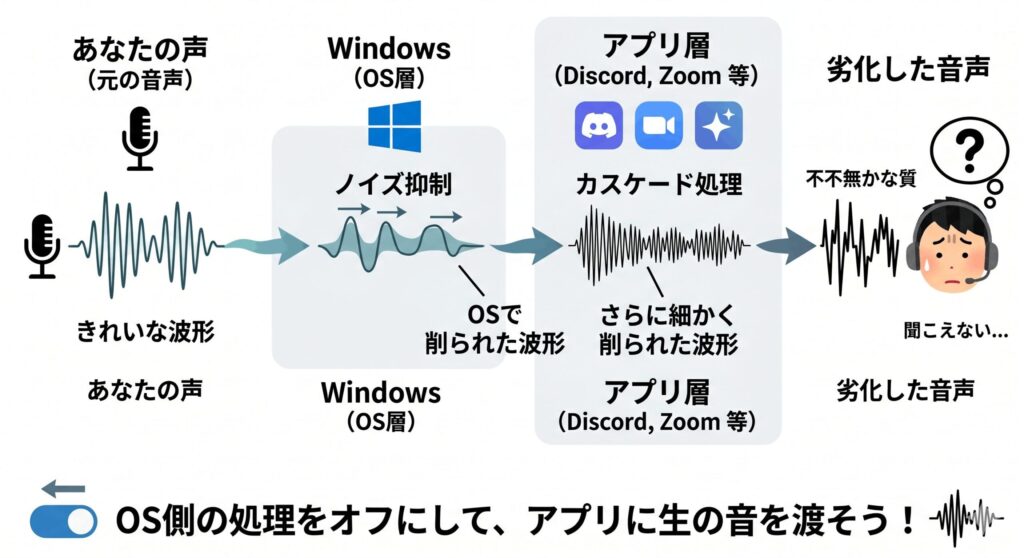 Windows11には、音声を自動で綺麗にしてくれる「オーディオ機能拡張」という仕組みがあります。一見良さそうに聞こえますが、実はこれがトラブルの元になることが多いんです。特にDiscordやZoomなどのアプリを使っている場合、アプリ側でもノイズキャンセリングを行っているため、処理が二重に重なって(カスケードして)しまい、声がロボットみたいに不自然になったり、語尾がプツプツ切れたりする原因になります。ここ、見落としがちなポイントですよ。