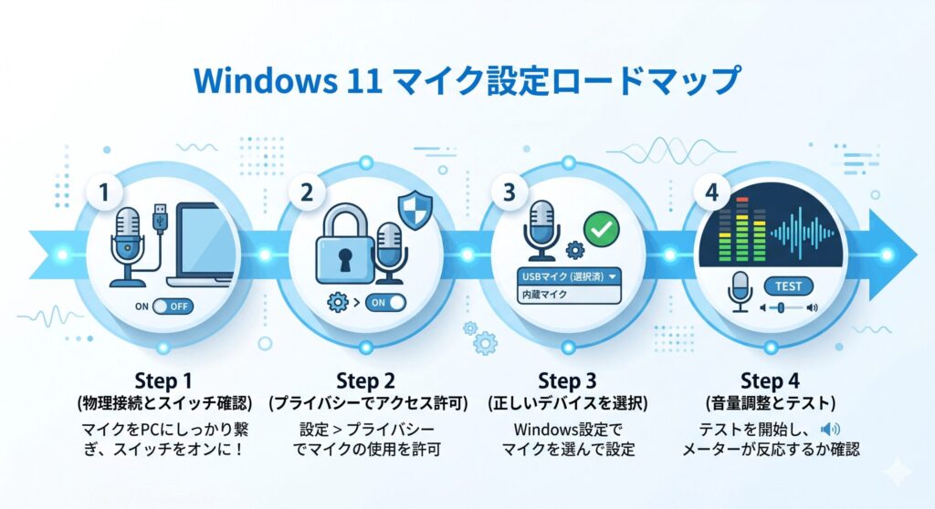まずは、Windows11でマイクを使い始めるための土台作りから見ていきましょう。最新のOSでは設定の入り口が統合されていますが、基本的な「繋ぐ・許可する・選ぶ」というステップは変わりません。一つずつ確実に確認していきましょうね。