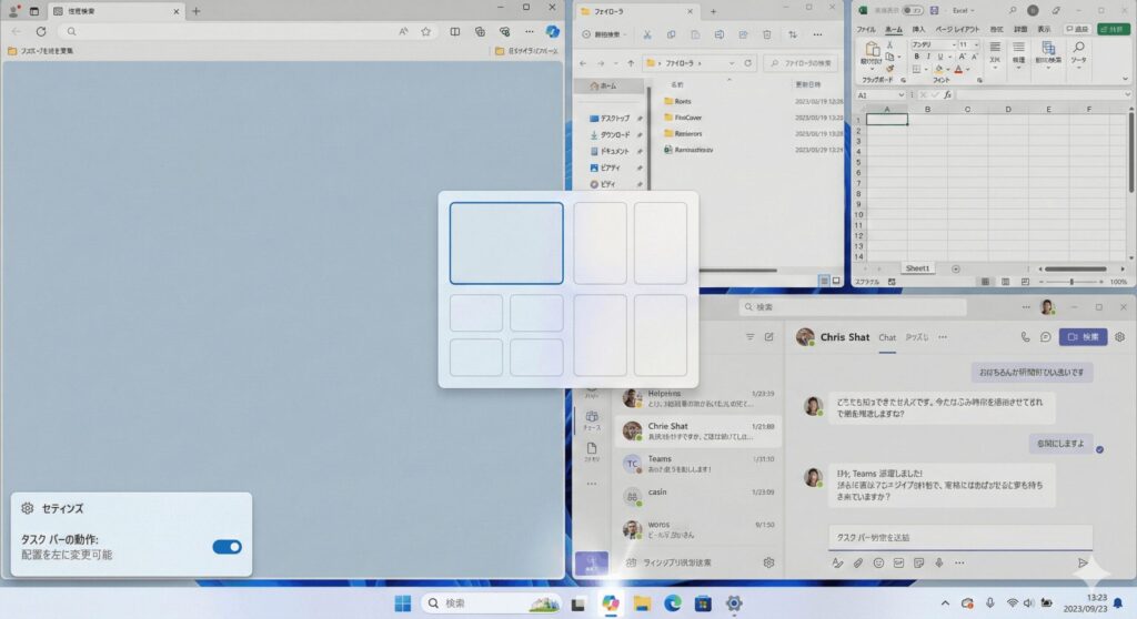 さらに、配置したウィンドウのセットを「スナップグループ」として記憶してくれる機能もあります。例えばブラウザとExcelを並べて作業している時に別のアプリを開いても、タスクバーからそのセットを丸ごと呼び戻せるんです。複数の作業を並行して行うプロフェッショナルな環境において、この視覚的なアシストは絶大な威力を発揮しますね。