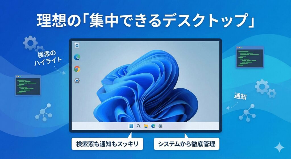 基本はタスクバーの設定変更ですが、メーカー製PC特有のアプリや、検索のハイライト、通知設定など、チェックすべき場所は意外と多いものです。一つずつ確認して、自分にとって最適なデスクトップ環境を作り上げていきましょう。