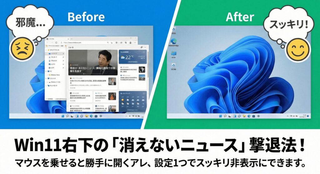 Windows11のデスクトップで、右下や左下に表示されるニュースの正体は、主に「ウィジェット」という機能です。まずは基本となるOSの設定から見直して、快適な環境を取り戻しましょう。