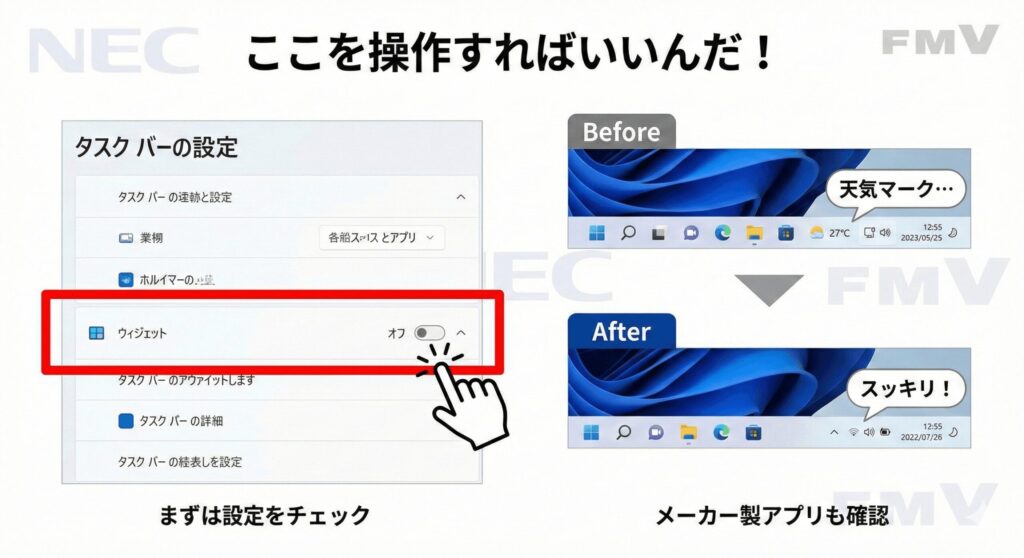 これらはOSのウィジェットとは独立して動作しているため、個別の対処が必要です。特にNECのLAVIEシリーズや富士通のFMVシリーズには、独自のニュース配信アプリが搭載されています。