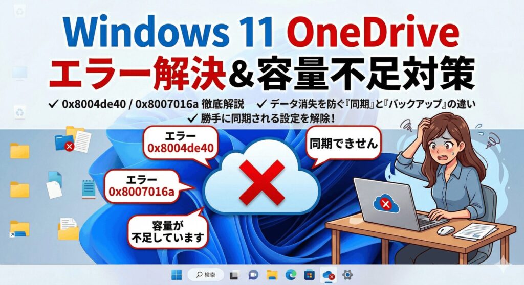 特に「同期」と「バックアップ」の違いを理解しておくことは、大事なデータをうっかりローカルから消してクラウドからも消し飛ばしてしまわないための、必須の知識かなと思います。もし0x8007016aや0x8004de40といった複雑なエラーが起きたときも、今回ご紹介したネットワーク設定の見直しやリセットコマンドを知っていれば、焦らずに対処できるはずです。