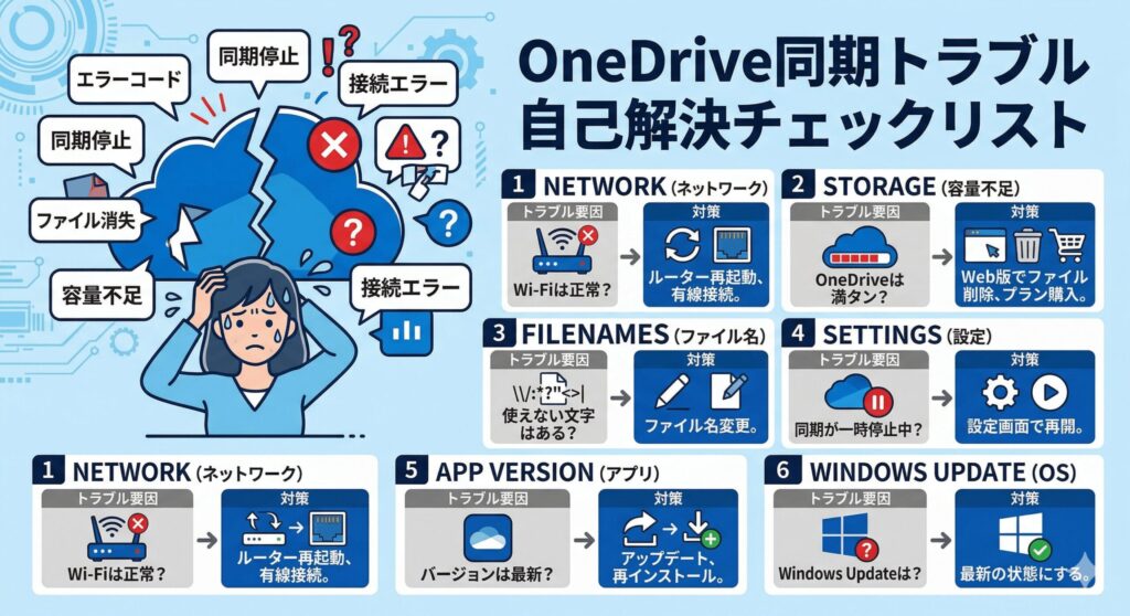 お疲れ様でした!今回は、容量不足のアラートや勝手なアップロードに悩まされがちな、Windows 11のOneDriveの最適化手法やトラブルシューティングを中心にお届けしました。ファイルの双方向同期やファイルオンデマンドの仕組みを根本から知っておくことで、パソコンの限られたストレージをかしこく管理できるようになりますよね。