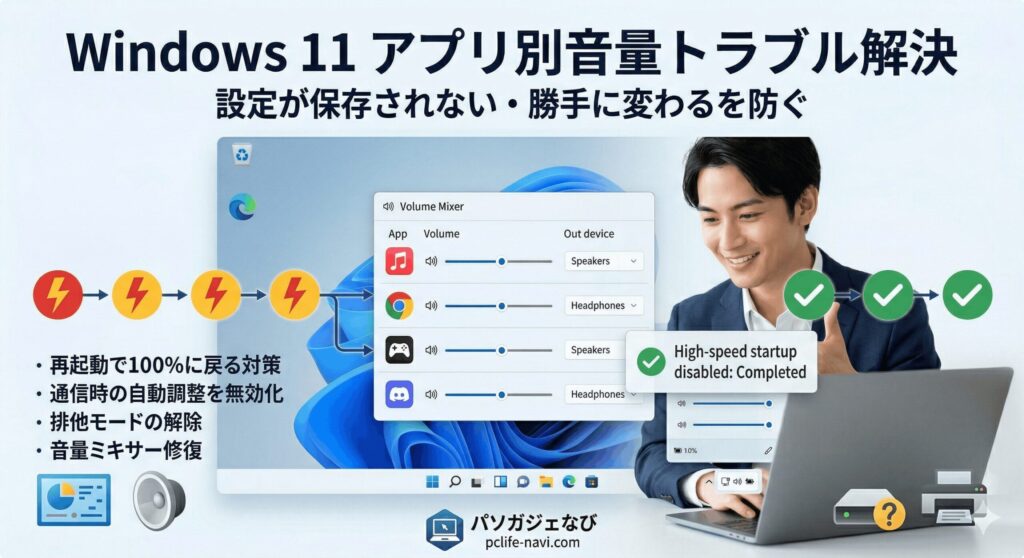 Discordや特定のゲームで音量を下げたのに、パソコンを再起動すると毎回100%の爆音に戻ってしまう…。これ、本当に心臓に悪いですよね。長年多くのユーザーを悩ませているこのバグですが、一番の原因はWindowsの「高速スタートアップ」という機能にあります。