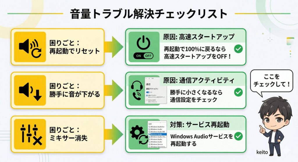設定方法は分かったけれど、思い通りに動かないのがWindowsの厄介なところですよね。ここでは、「音量設定が保存されない」「ミキサーが開かない」「勝手に音量が変わる」といった、よくある深刻な不具合とその具体的な直し方について解説していきます。
