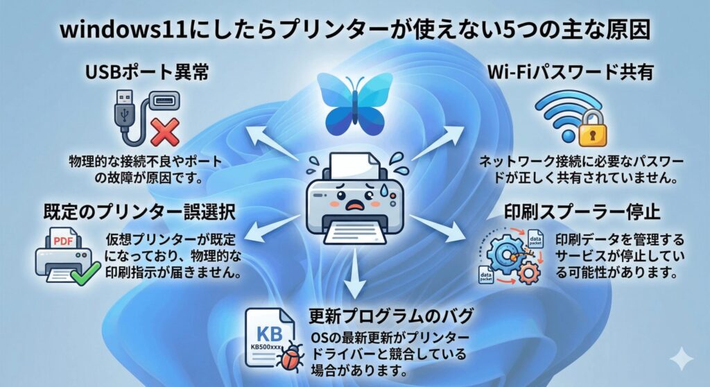 「設定がおかしいの?」「プリンターが壊れたのかな?」と不安になるかもですが、実はOSの仕様変更が原因になっていることが多いんです。まずは、なぜ突然印刷できなくなるのか、その代表的な原因を5つ紹介しますね。