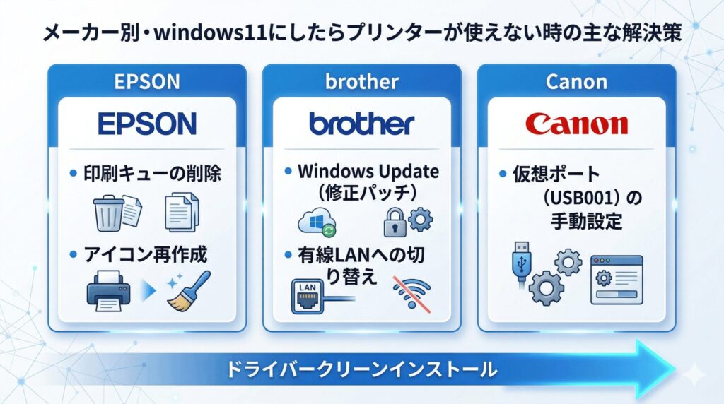 - エプソン、ブラザー、キヤノンなどのメーカー別トラブル解消法