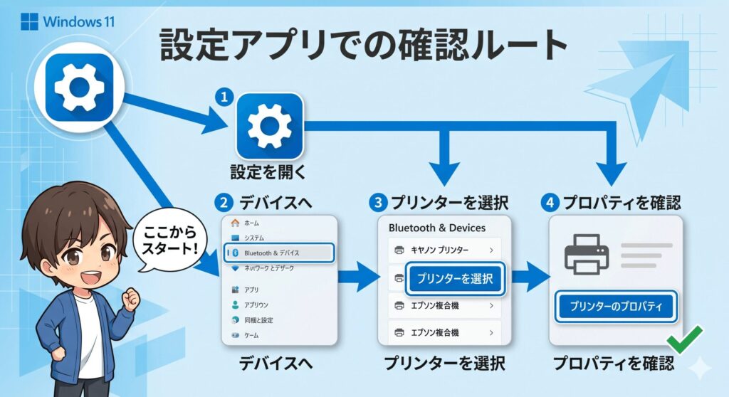 Windows 11で最も手軽なのは、刷新された「設定」アプリを使うルートです。スタートメニューの歯車アイコンから「Bluetooth とデバイス」を開き、「プリンターとスキャナー」を選択すると、現在登録されているデバイスが一覧で表示されます。特定のプリンターをクリックして「プリンターのプロパティ」を選択すると、お馴染みの設定ダイアログが立ち上がります。ここまでは基本ですね。