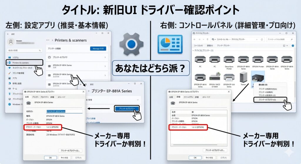 エプソンやキヤノンといった大手メーカーのプリンターを使っている場合、OS標準のドライバーではなく、メーカーが配布している専用の「製品付属ドライバー」を使っているかどうかが、使い勝手を左右します。判別方法は、プロパティ画面の「デザイン」を見ることです。メーカー独自のロゴが入ったカラフルな設定画面が表示されれば専用ドライバー、Windows標準の質素な画面なら標準ドライバーだと分かります。