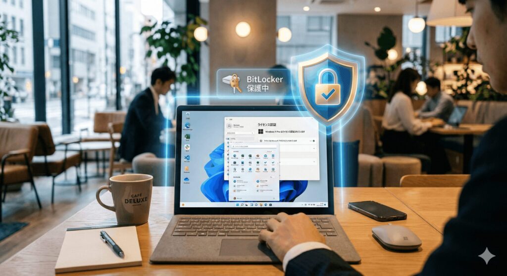 なぜ高いお金を払ってPro版を選ぶのか?その大きな理由の一つが、強力なセキュリティ機能「BitLocker」です。これはドライブ全体を暗号化してくれる機能で、万が一ノートPCを紛失したり盗難に遭ったりしても、中のデータを第三者に読み取られるのを防いでくれます。ビジネスでPCを使うなら必須と言ってもいい機能ですね。
