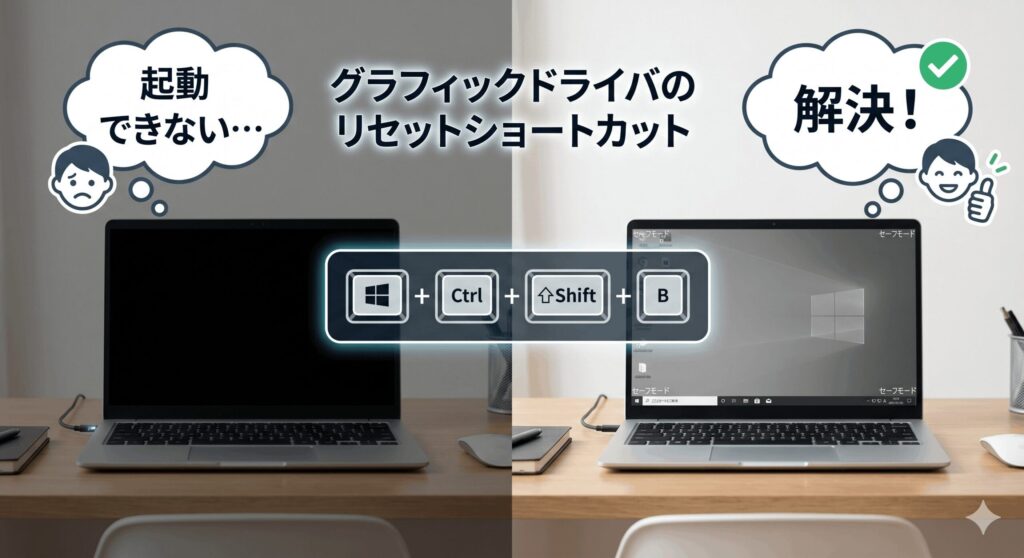 ソフトウェア的なリセットとして、キーボードの「Windowsロゴキー + Ctrl + Shift + B」を同時に押してみるのも手です。これはグラフィックドライバを強制的に再起動する隠しコマンドで、うまくいけば「ピッ」という音と共に画面が復帰します。セーフモードでも標準ドライバが死んでいる場合に有効なことがあります。ここ、試してみる価値は大アリですよ。