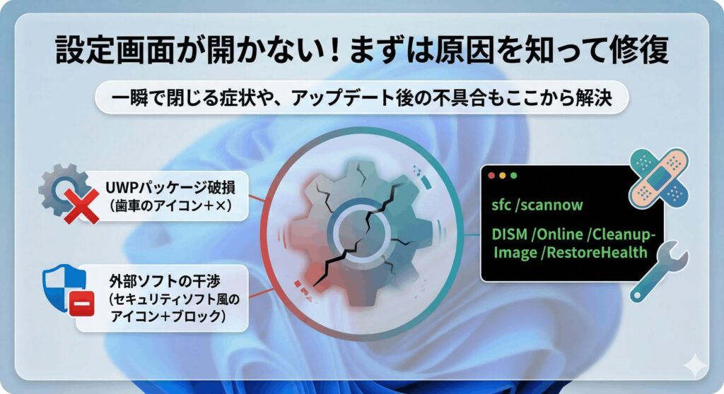 設定アプリがクラッシュする主な原因は、アプリ自体のパッケージ破損か、Windowsのコアとなるシステムファイル(コンポーネントストア)の欠損です。