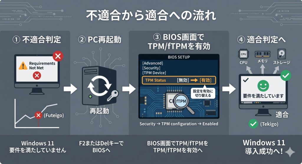 まずは公式の「PC正常性チェックアプリ」で全体の合否を確認すること。そして、もしダメだった場合は「CPUがリストに入っているか」「TPM 2.0やセキュアブートがBIOSで有効になっているか」をチェックしてみてください。多くの場合は、BIOSの設定一つで不適合から適合に変わるはずです。一方で、どうしても物理的なスペックが足りない場合は、無理な回避策をとるのではなく、セキュリティと安定性のためにハードウェアの更新を前向きに検討してくださいね。