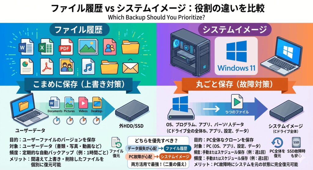 まずはバックアップの土台となる基礎知識を整理していきましょう。Windows 11には、目的の異なる2つの強力な標準機能が備わっています。これらを正しく使い分けることが、データ保護の第一歩になりますよ。