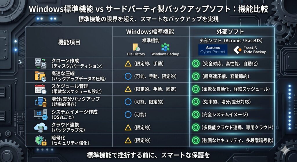 Windows標準機能も優秀ですが、もっと手軽に、確実にバックアップを取りたいなら「Acronis true image」や「EaseUS Todo Backup」といった専用のサードパーティ製ソフトを使うのも一つの正解です。これらのソフトの最大の魅力は、なんといってもその「分かりやすさ」と「多機能さ」にあります。標準機能では苦戦するようなエラーも、専用ソフトなら独自のエンジンで回避してくれることが多く、クリック数回で複雑なバックアップ設定が完了してしまうんです。