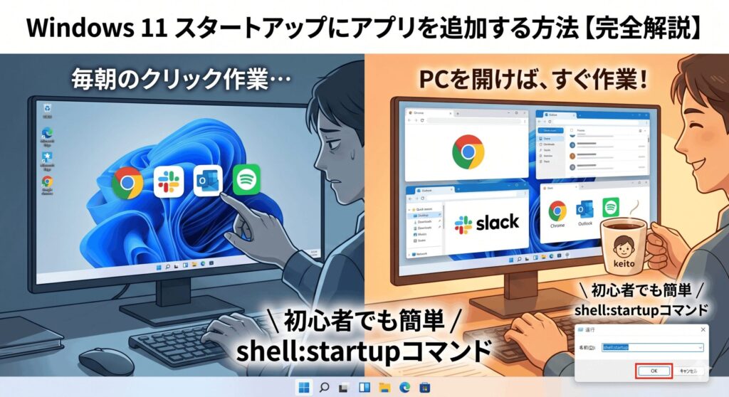 こんにちは、パソガジェなびのkeitoです。PCを起動したときに、いつも使うアプリが勝手に立ち上がってくれたら便利ですよね。windows11 スタートアップにアプリを追加する方法を知っておくと、毎日の作業開始がスムーズになります。ただ、設定画面でアプリを登録できない場合や、ショートカットの場所がわからないといった悩みを持つ方も多いかなと思います。この記事では、初心者の方でも迷わず設定できるように、基本的なショートカットの作成から管理者権限の回避、2025年や2026年に向けた最新の最適化術まで詳しく解説します。あなたのWindows 11環境を、電源を入れた瞬間に最高のワークスペースへ変えるお手伝いができれば嬉しいです。
