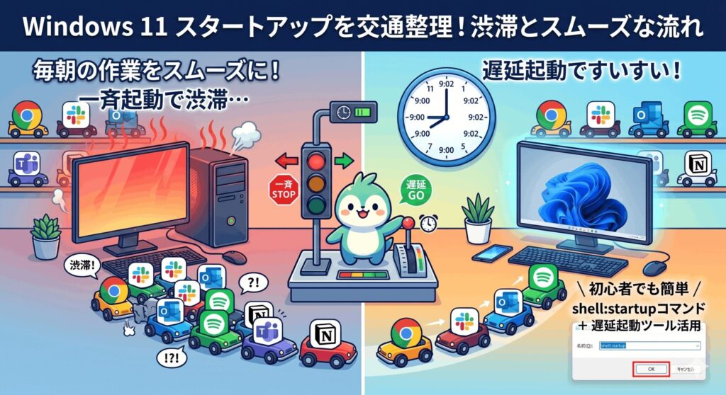 「どうしても10個くらいのアプリを自動起動させたい!」というパワーユーザーの方におすすめなのが、起動タイミングを意図的にずらす「ディレイ起動」のテクニックです。Windowsの標準機能では、ログインした瞬間にすべてのアプリが「よーいドン」で一斉に起動しますが、これをバッチファイルを使って制御することで、システムの負荷を平滑化できるんです。リソースのロードバランシング(負荷分散)という考え方ですね。