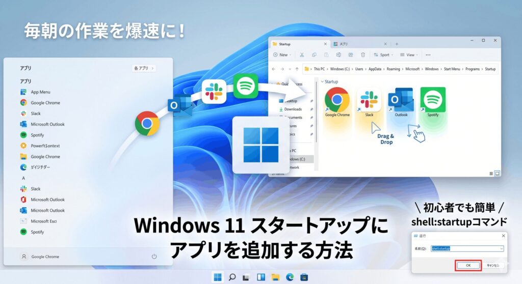 Windows 11で最も手軽に、かつ安全に「windows11 スタートアップにアプリを追加する方法」を実践するなら、「shell:startup」という隠しコマンドを使うのが一番です。エクスプローラーを辿って深い階層にあるフォルダを探すのは大変ですが、このコマンドを使えば一瞬で専用フォルダにアクセスできるんですよ。