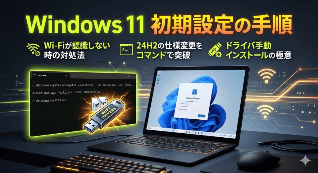 解決策としては、別のパソコンを使ってメーカーのサイトからドライバをダウンロードし、USBメモリに移して読み込ませる方法があります。設定画面でコマンドプロンプトを起動し、「pnputil」というコマンドを使ってUSBの中のドライバを強制的に認識させるんです。少し難しく感じるかもしれませんが、この手順さえマスターすれば、どんな最新パソコンでも自力でネットに繋げることができるようになりますよ。