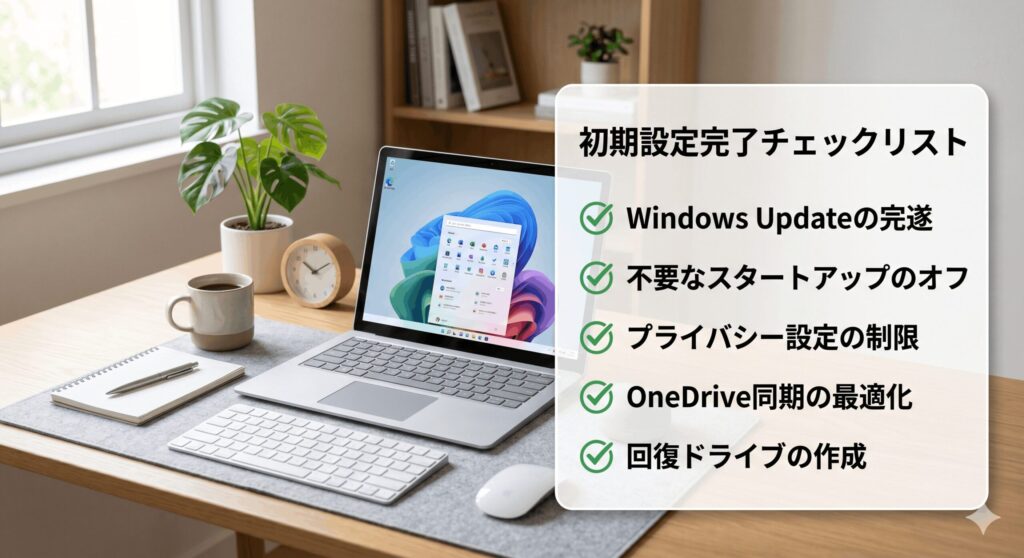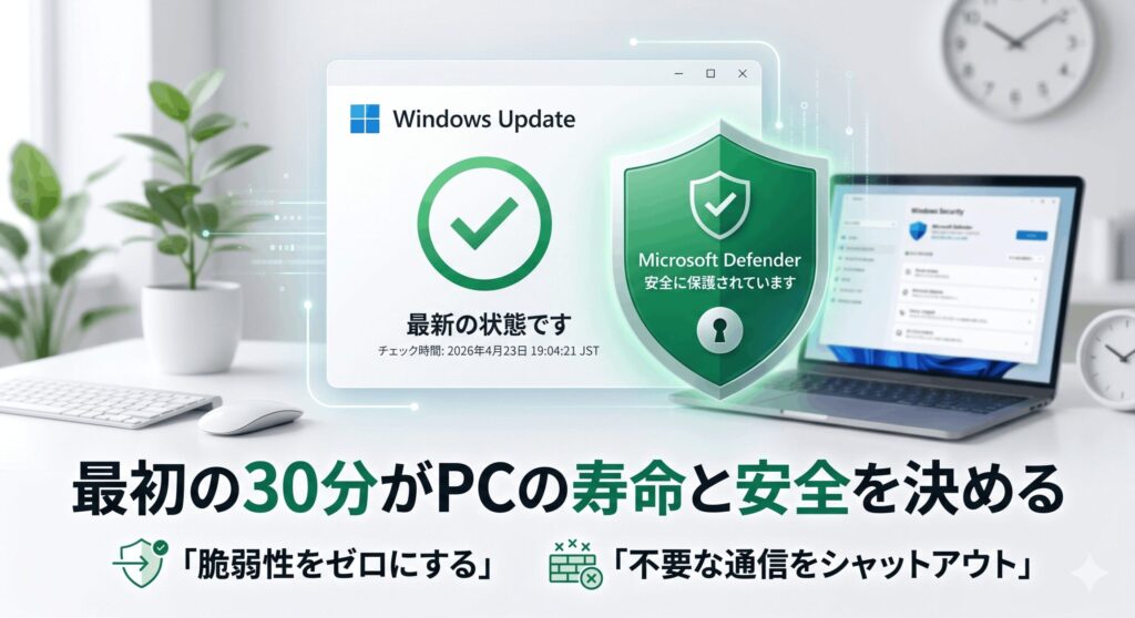 デスクトップ画面が出たら「完了!」と思いがちですが、実はここからの「仕上げ」がパソコンの寿命と快適さを左右します。せっかくの新品を最高の状態で使いこなすために、私がいつもやっている「最初の30分」の最適化手順を伝授しますね。