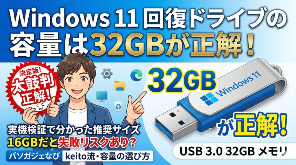 いかがでしたでしょうか。Windows11の回復ドライブ作成におけるUSBメモリ容量の選び方や、エラー対策について詳しく解説してきました。16GBの表示に惑わされず、最初から32GBの標準的なUSBメモリを選ぶことが、一番のトラブル回避への近道だと分かっていただけたかなと思います。